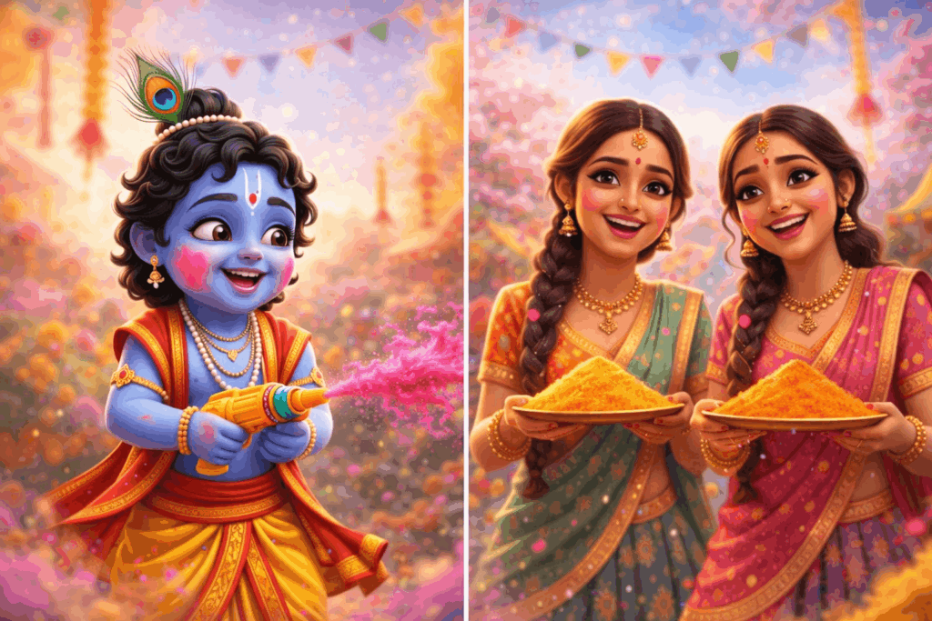 Cinematic AI-generated artwork is transforming digital creativity, especially when it blends mythology, emotion, and high-end 3D realism. One trending concept combines spiritual storytelling with animated film aesthetics — a close-up cinematic scene of baby Krishna applying pink gulal on a smiling girl’s cheek, designed in Disney Pixar-style realism.